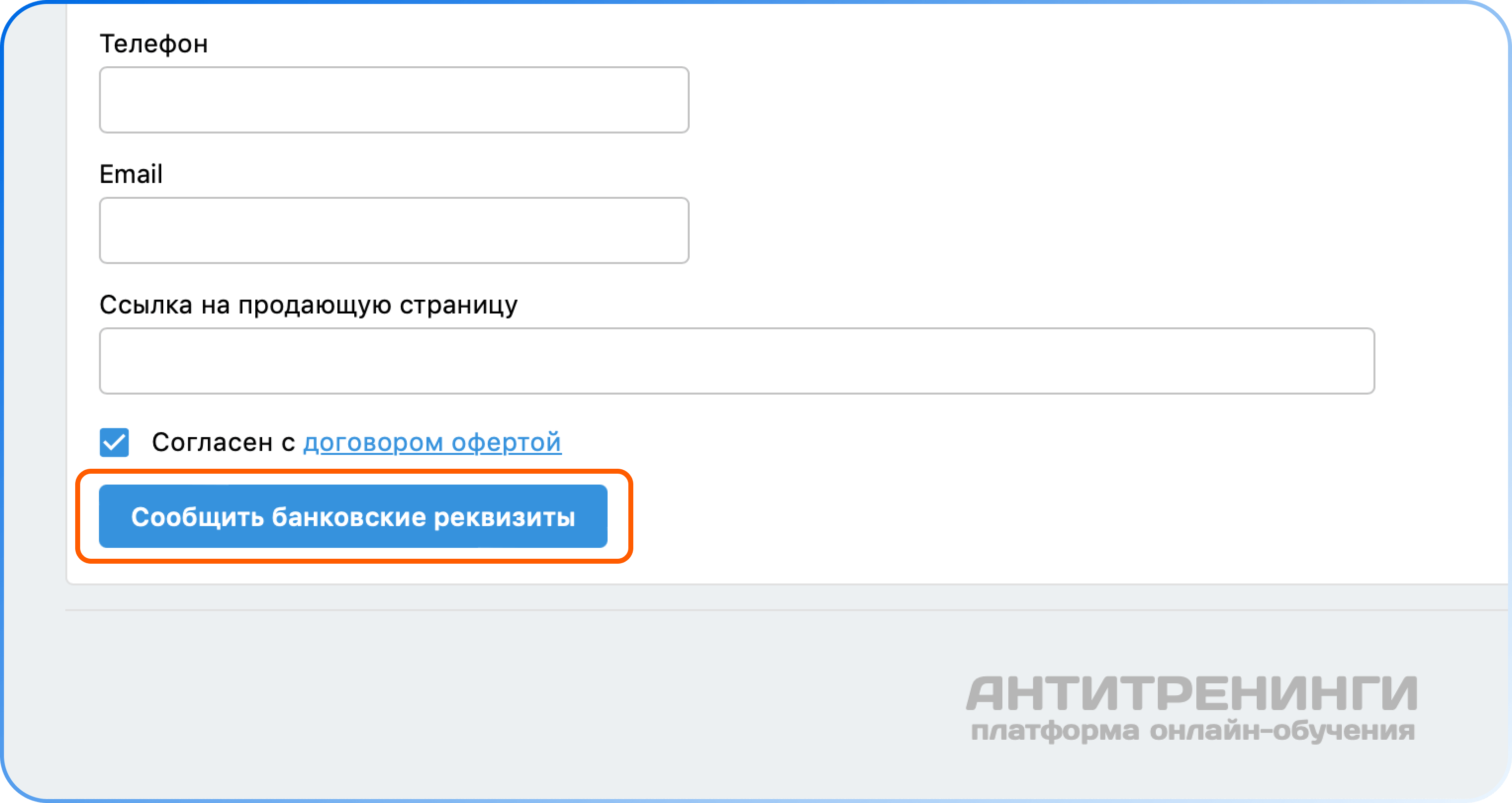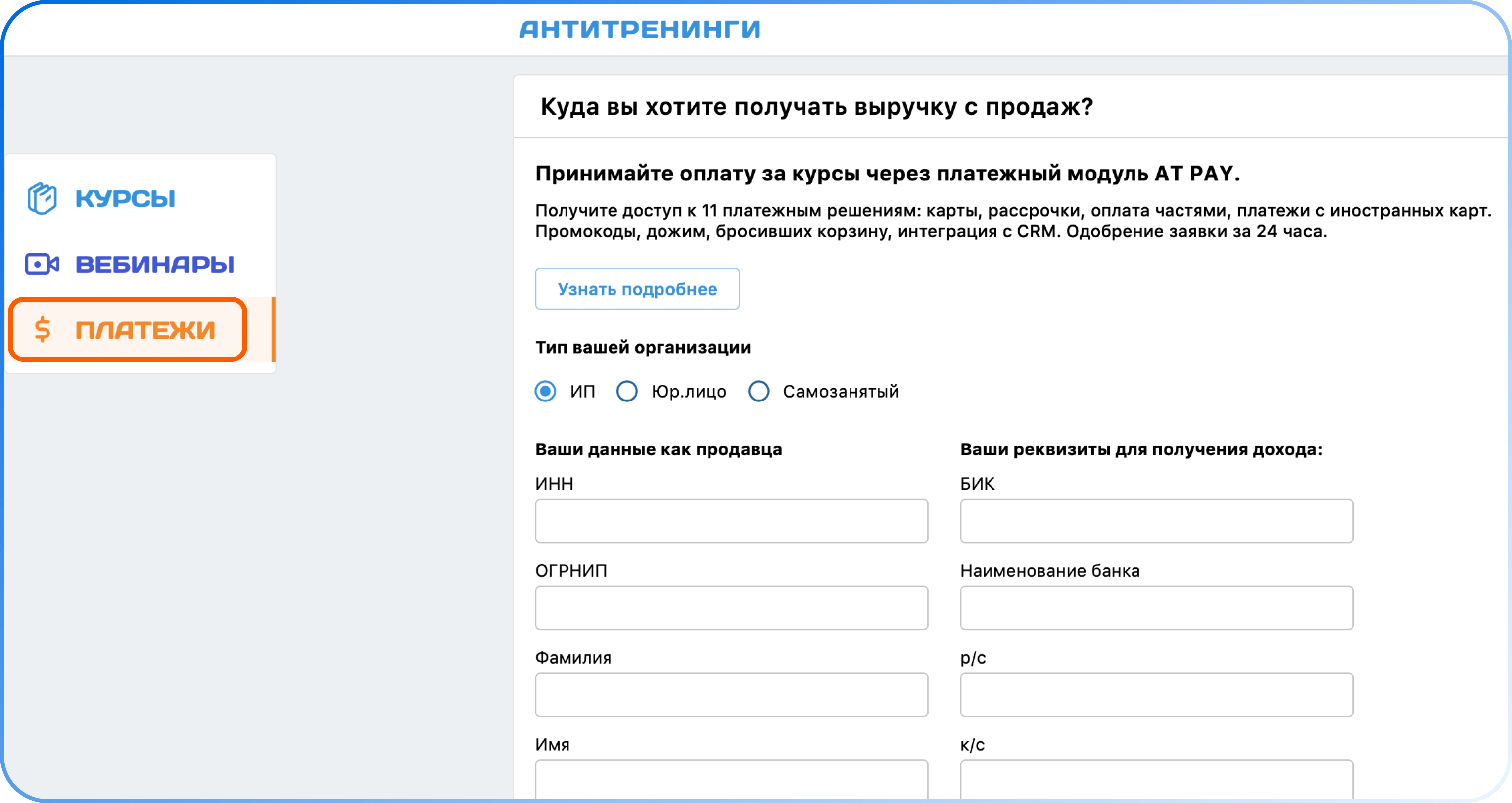 Я принимала оплаты из Казахстана. Они проходили без каких-либо проблем, также, как и одобрялись рассрочки. Плюс меня очень порадовало, что платёжная система находится на той же платформе, где и мой курс. Это очень удобно. Во-первых, потому что я обожаю вашу техподдержку. Я это всегда говорю. Они очень помогают. Во-вторых, нравится, как это всё выглядит, когда клиент оплачивает, всё чётко, понятно, наглядно. В-третьих, система бесшовно интегрирована в Антитренинги.